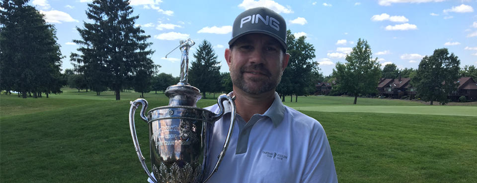 Stephen Gangluff (Delaware, OH) opened his 2018 Davey Tree/Minute Men Ohio Open campaign on a torrid pace at Fox Meadow Country Club where he shot an 8 under 64. This fast start paired with another great round of 66 on Tuesday at Weymouth Country Club put him at 14 under and in a strong position to hoist the Commodore Perry Ohio Open Trophy today as the 98th Davey Tree/Minute Men Ohio Open Champion. His three day total was 64-66-73 (203) -13. Second Place finisher, Nathan Tarter (Akron, OH) did not make it easy for Gangluff today, though. Nathan made a strong charge for the championship which included an eagle on Hole #14 to finish just one shot back at 12 under with a score of 69-66-69 (204). Defending Champion, Chase Wilson (Zanesville, OH) finished in third place with a score of 65 68 74 (207).